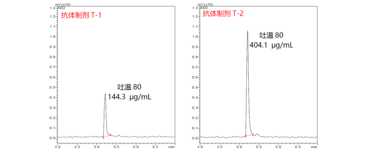 我们开发了一种检测抗体药物中吐温80含量的方法,并应用于两种抗体制剂中吐温80含量的测定,两种抗体制剂中吐温80的含量分别为144.3 μg/mL和404.1 μg/mL。