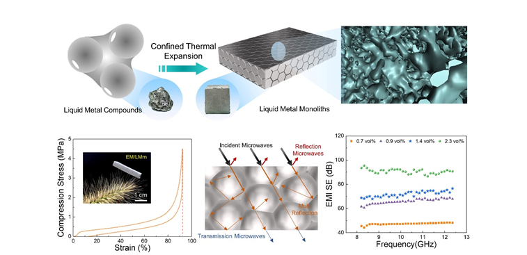 近日,中国科学院深圳先进技术研究院、深圳先进电子材料国际创新研究院孙蓉团队在利用可膨胀聚合物微球(EM)在限域空间中的热膨胀和微观界面自融合过程,原位构筑精细化LM导电网络,开发出具有可裁切、低密度、高压缩率、超回弹、高承载力和高电导率特性的类“金属气凝胶”LM基电磁屏蔽复合泡沫,相关成果以Tailorable, Lightweight and?Superelastic Liquid Metal Monoliths for?Multifunctional Electromagnetic Interference Shielding为题发表于期刊Nano-Micro Letters(IF=16.419)。许亚东助理研究员为论文第一作者,胡友根副研究员、孙蓉研究员为论文共同通讯作者。