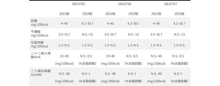 新国标新增了牛磺酸和二十二碳六烯酸(DHA)的最小值要求,修订了二十二碳六烯酸和二十碳四烯酸的单位。