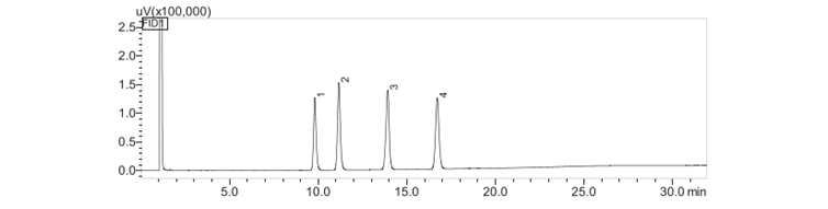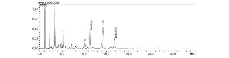 EPA甲酯、DHA甲酯、AA甲酯和内标标准溶液色谱图(浓度:0.5mg/mL)